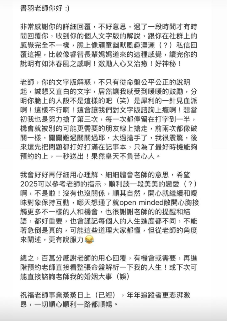 客戶好評27:書羽老師不只有從命盤公平公正的說明,還有暖暖的鼓勵!