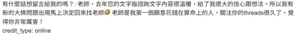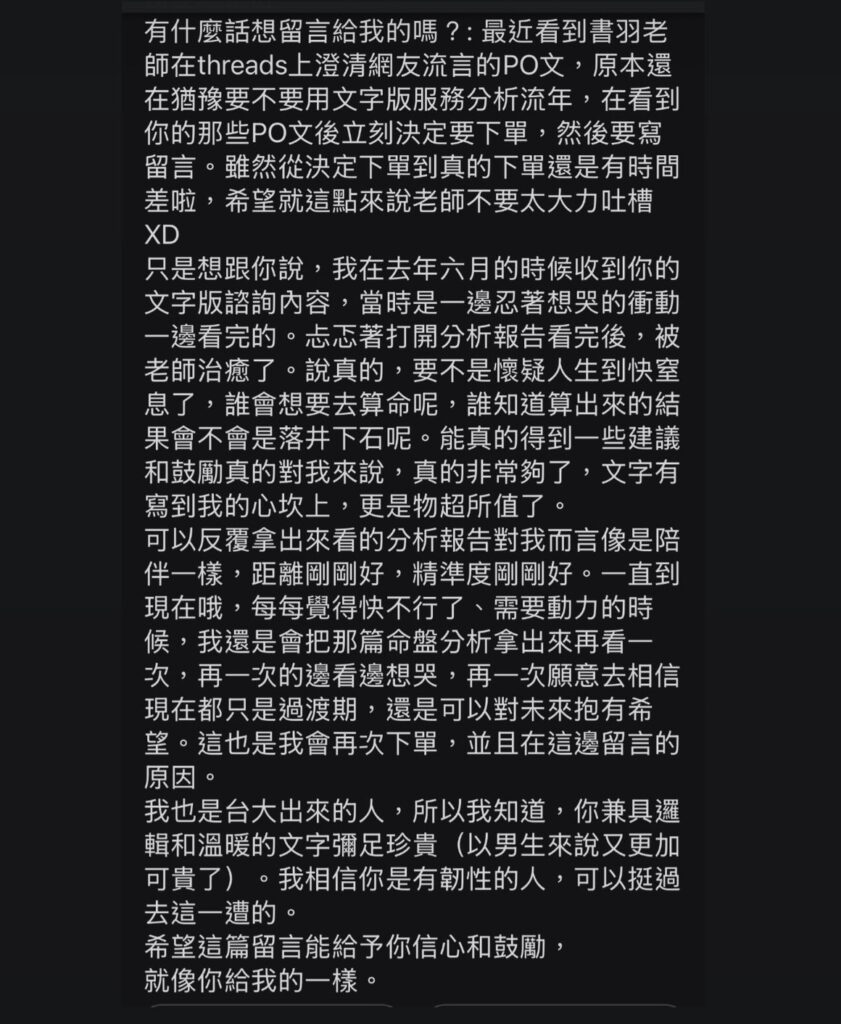 老師昨天真的很謝謝你的詳細解析,準到很可怕😂我也從來沒有想過原來***是我的人生課題(一 直覺得那只是巧合),謝謝老師的指點迷津,雖然我後來想想有些忘記問的問題不過我可以買文字版的來問…吧?😂生涯規劃的部分跟我自己預料的差不多,我最意外的是感情部分啦🤪感情部分真的亂七八糟,都不知道找誰說,老師沒有批評我真的很謝謝🙏🙏