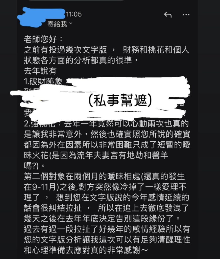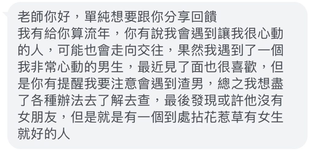 客戶好評36:算流年很準,果然遇到了桃花,也事前提醒可能會遇到渣男