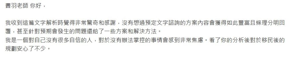 我是一個對自己沒有很多自信的人,對於沒有辦法掌控的事情會感到非常焦慮。看了你的分析後對於移民後的規劃安心了不少。